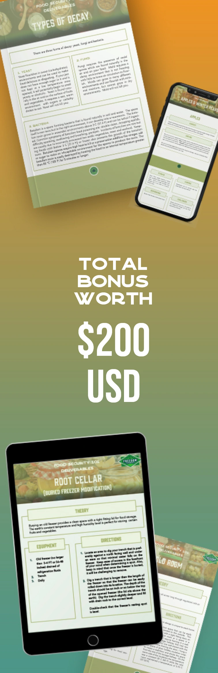 The course is wrapped up with a comprehensive recap over the 5 Cold Storage Systems and 7 Preservation Methods so that you leave with a tight grasp on Food Storage Theory, as well as the step-by-step instructions for accomplishing your specific goals.